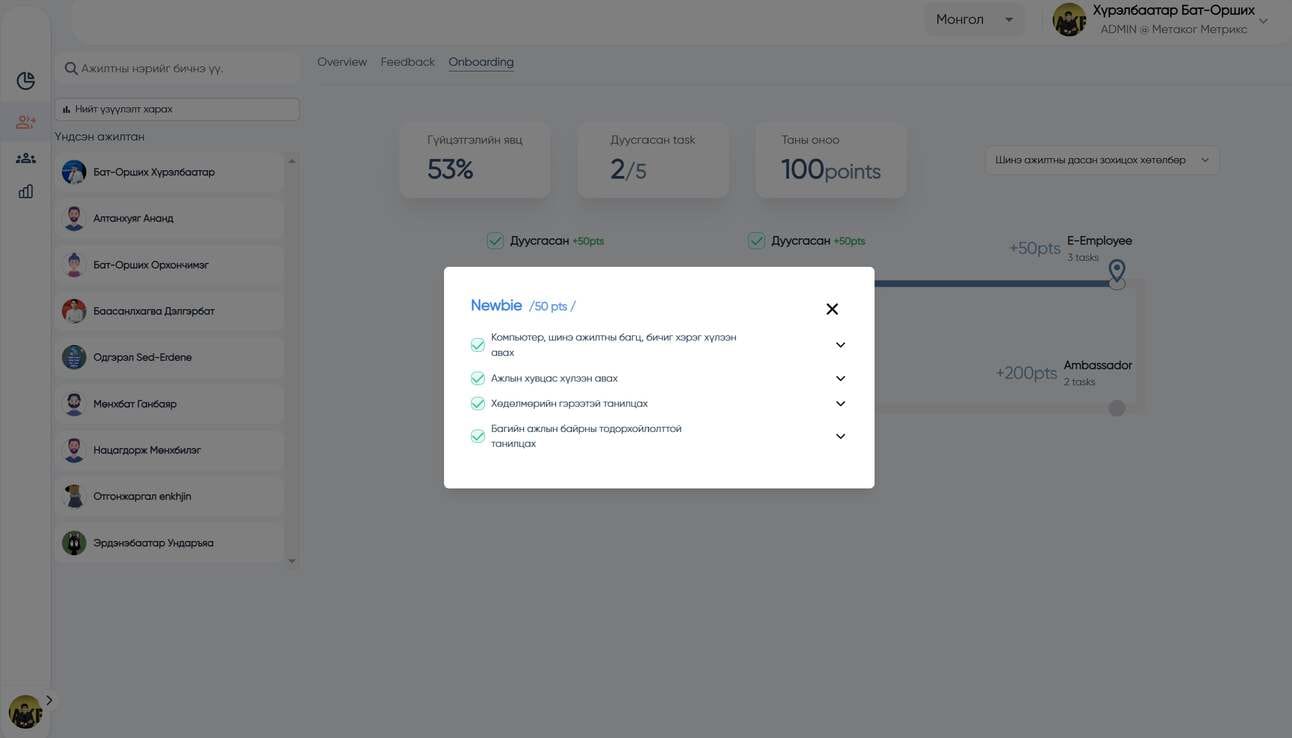 Бид шинэ ажилтны дасан зохицох хөтөлбөрийг шинээр нэвтрүүлсэн билээ. Харин одоо хүний нөөцийн багийнхан шинэ ажилтнуудынхаа дасан зохицох хөтөлбөрийн явцтай танилцаж, хэрэгцээт мэдээллээр ханган, шаардлагатай үед шууд дэмжлэг үзүүлэх боломжтой боллоо.