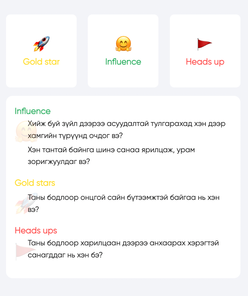 Үр дүн: Энэ тоглоом нь багийн гишүүдийн манлайллын хэв маяг, уян хатан чанарыг илтгэхийн зэрэгцээ хамтын зорилгод хүрэхэд итгэлцэл, үггүй харилцааны ач холбогдлыг ойлгоход тусална.